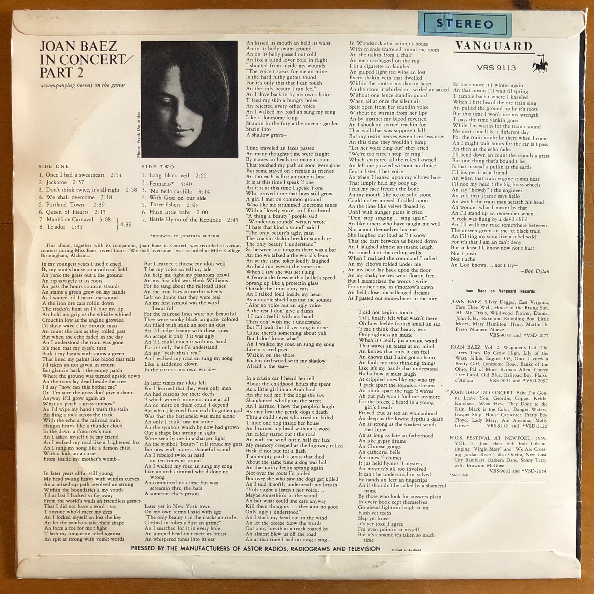 This is a preloved vinyl record of In Concert: Part 2 by Joan Baez. This album was first released in 1963 and this is an undated Australian stereo pressing, most likely from the 1960's). This is a live album from Joan Baez's 1962 concert tours.