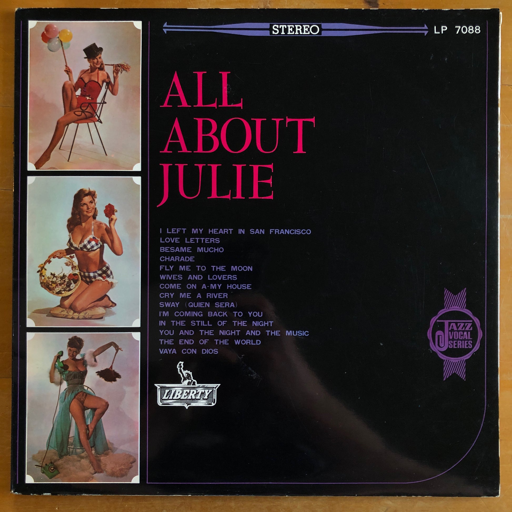 This is a preloved vinyl record of the album All About Julie by Julie London. The album was first released in 1964 and this is an original Japanese pressing from that year. It is presented on wine red vinyl, with a printed lyric insert and gatefold sleeve. Tracks include Cry Me A River, Wives and Lovers and Fly Me To The Moon.