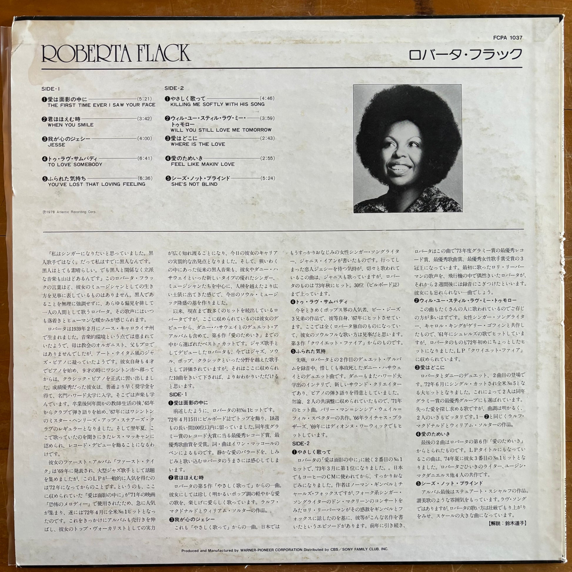 This is a preloved vinyl record of a self-titled album by Roberta Flack. This compilation album was first released in 1979 and this is an original Japanese pressing from that year. It includes the songs The First Time Ever I Saw Your Face, You've Lost That Lovin' Feeling and Killing Me Softly With His Song.
