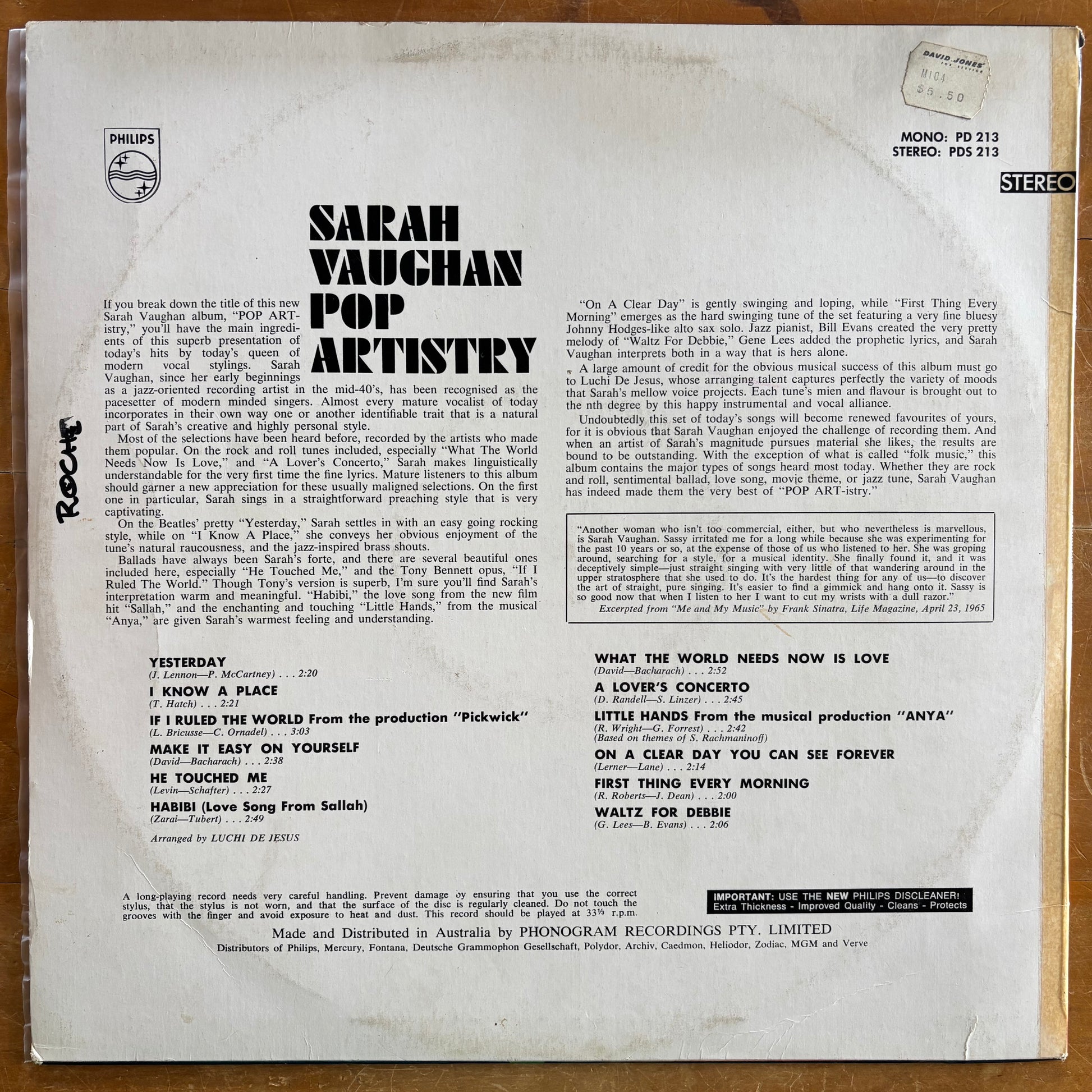 This is a preloved vinyl record of Pop Artistry by Sarah Vaughan. This album was first released in 1966 and this is an original Australian pressing from that year. This is Sarah Vaughan's 19th studio album.