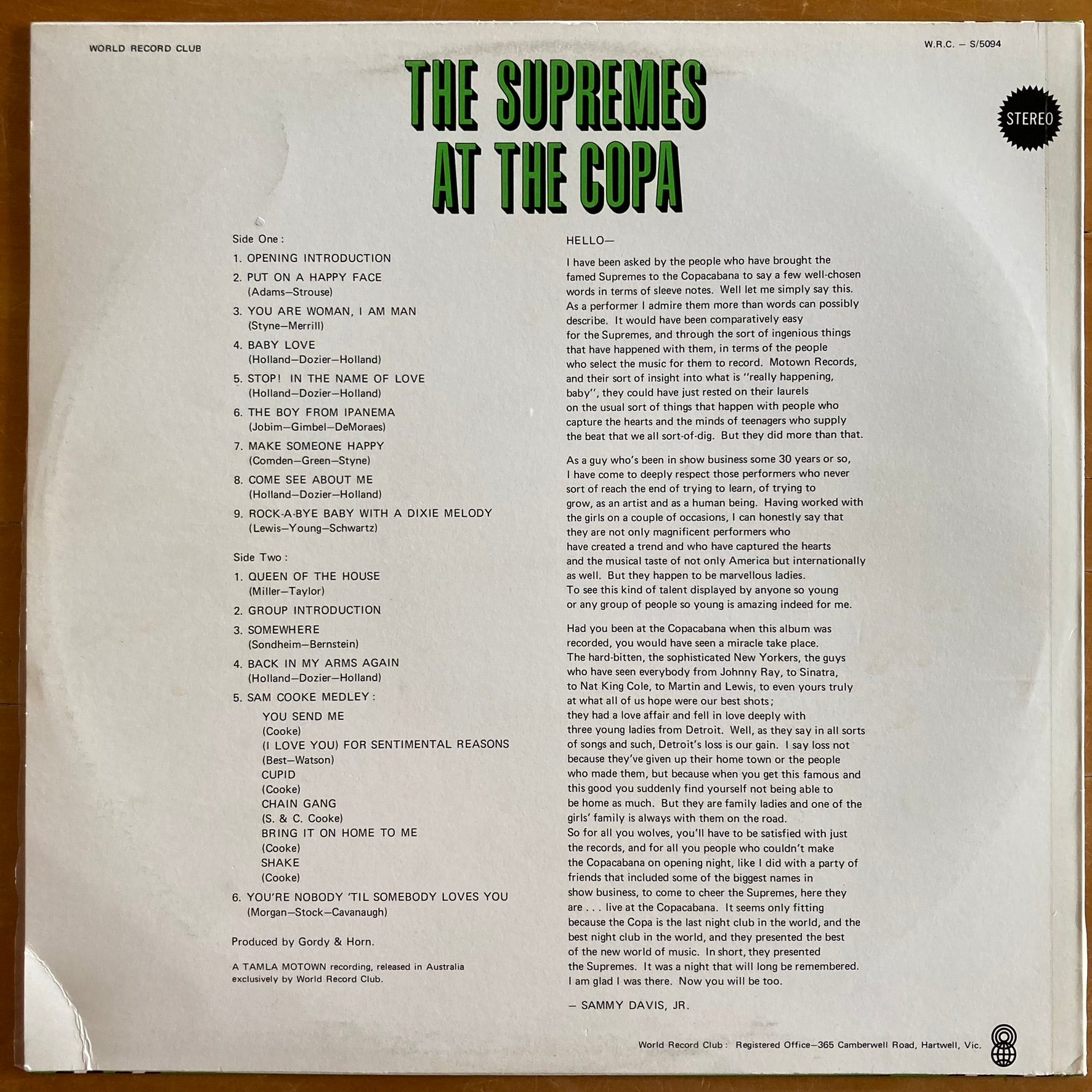 This is a preloved vinyl record of At The Copa by The Supremes. This live album was first released in 1965 and this is an Australian pressing from 1972. This live album was recorded at the Copacabana nightclub in New York City.